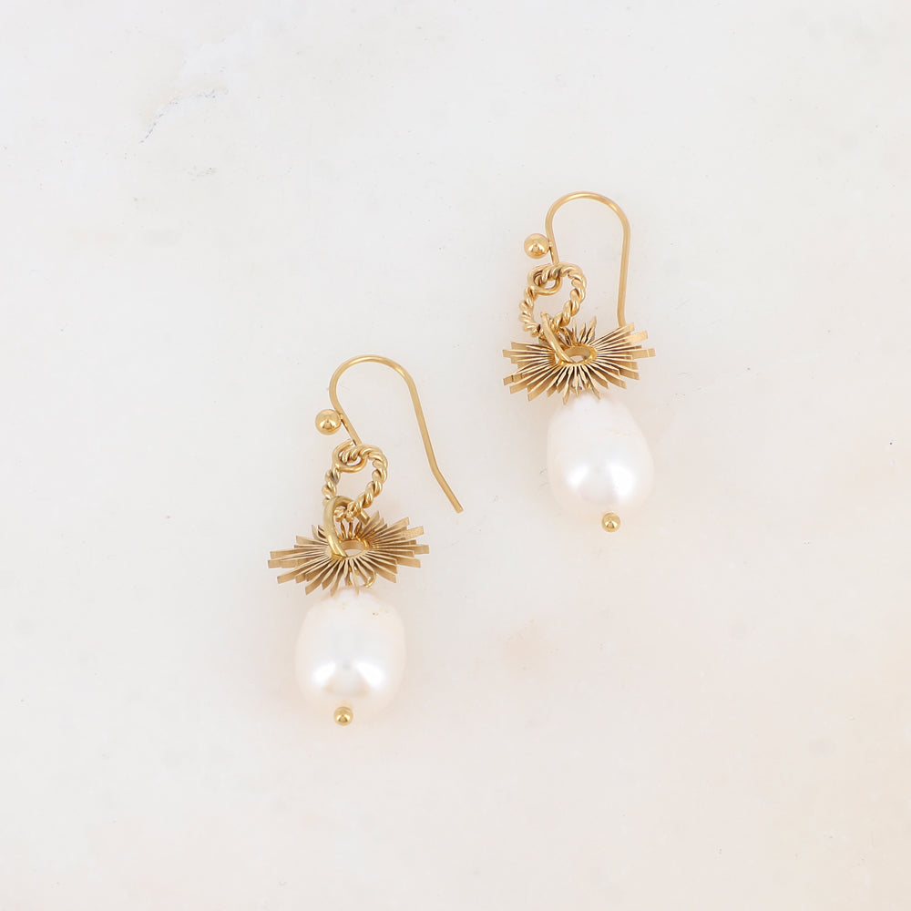 B.O à crochet avec perle d'eau douce et pampille soleil 1,5 x 4,1 cm.