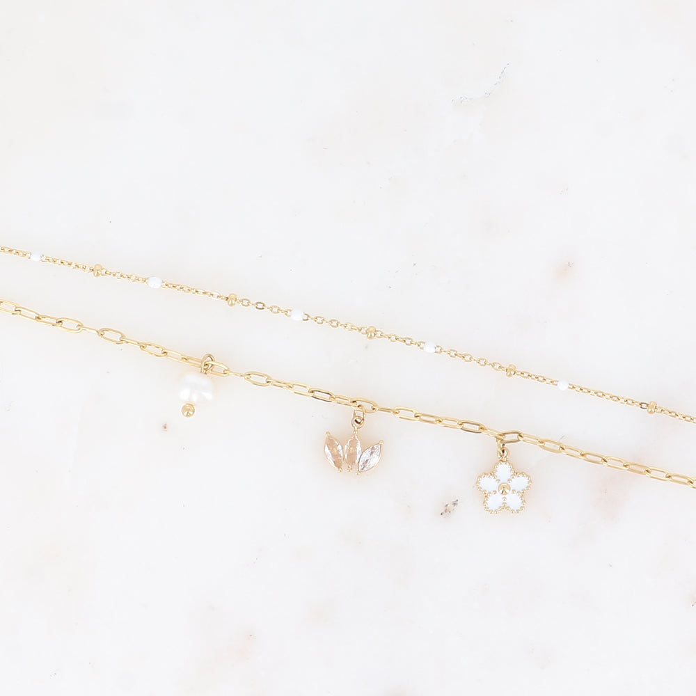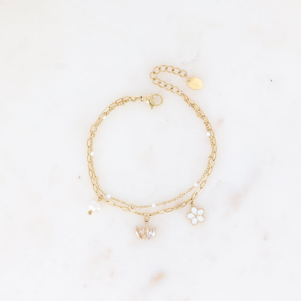 Bracelet 2 rangs - maille avec émail, anneaux ovales et 3 pendentifs (fleur, diadème de cristaux, perle d'eau douce) (16+3 cm)