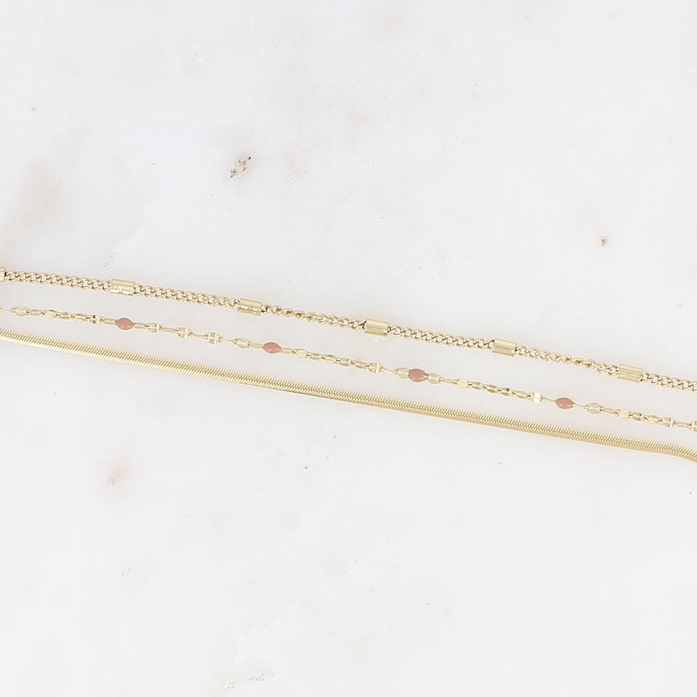 Bracelet 3 rangs - anneau avec maille grain de café émaillée marron, forçat et tubes et miroir (15+3 cm)