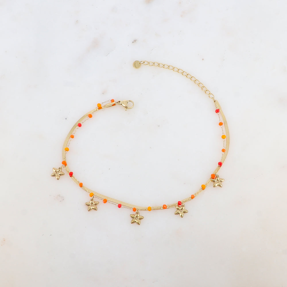 Chaîne de cheville 2 rangs avec maille miroir, pâtes de verres et pampilles fleurs (21+5CM)