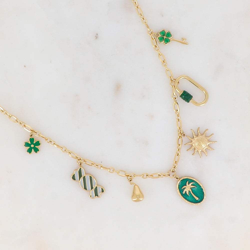 Collier en maille avec fleur émaillée, bonbons émaillé, pampille lisse, pampille ovale en émail motif palmier, soleil, anneau rectangulaire strassé, clé motif fleur en oxyde de zirconium (40+5CM)
