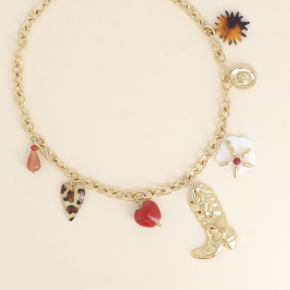 Collier - goutte perlée, coeur léopard, coeur en céramique émaillée, botte, fleur nacrée, étoile, chapeau, soleil en résine léopard 40+5 cm